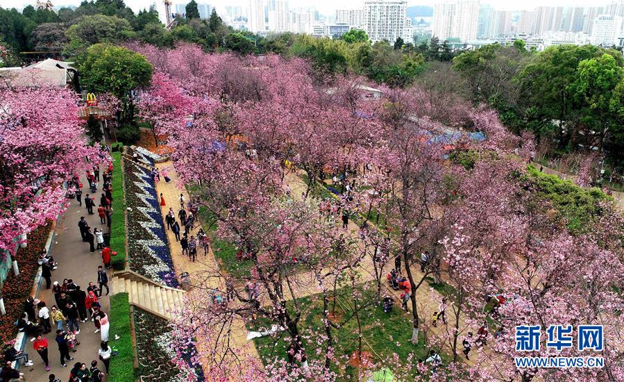 游人在昆明圆通山公园观赏盛开的樱花(3月16日无人机拍摄)。近日,云南省昆明市迎来樱花盛开的时节。昆明圆通山公园的数千株樱花灿烂绽放,吸引了市民和游客前来观花赏景。新华社记者秦晴摄