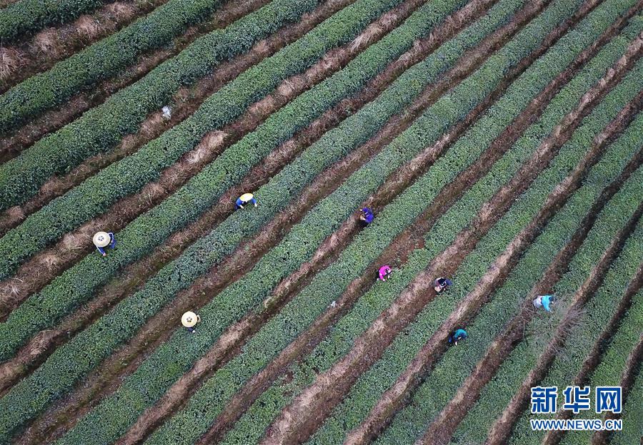3月17日,采茶工在丹寨县龙泉镇马寨村的茶园里采摘春茶(无人机拍摄)。新华社记者 杨文斌 摄