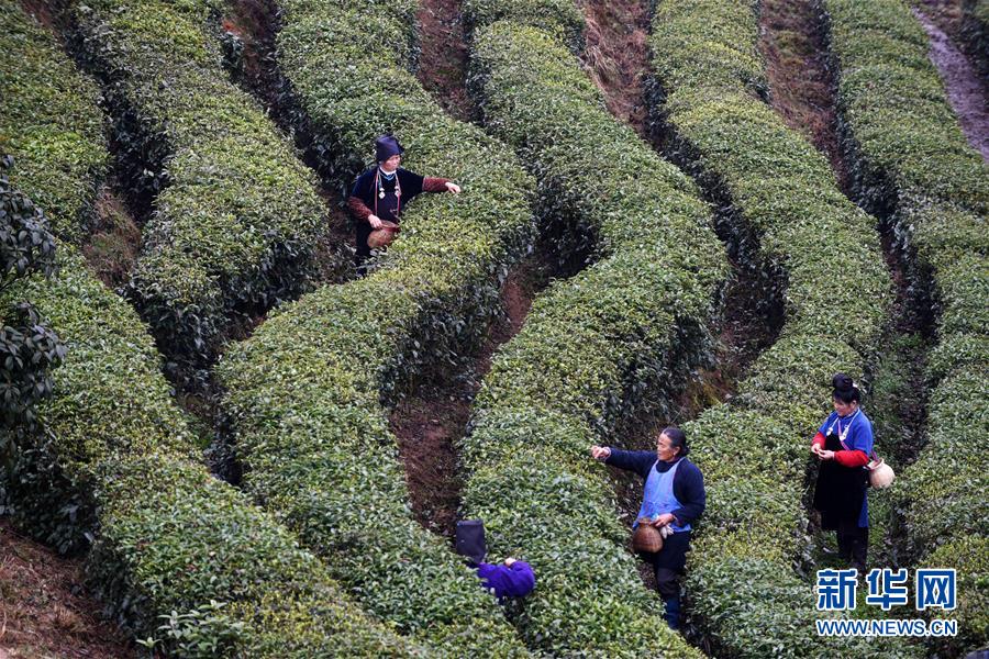 3月17日,采茶工在丹寨县龙泉镇马寨村的茶园里采摘春茶。新华社记者 杨文斌 摄
