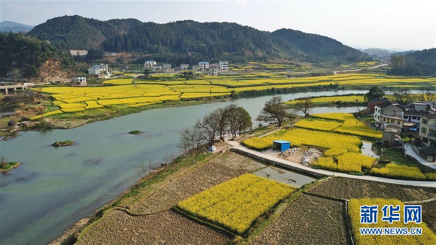 3月20日在贵州锦屏县敦寨镇拍摄的春景(无人机拍摄)。春分将至,贵州各地成片的油菜花渐次绽放,如同金色的地毯铺上云贵高原。 新华社记者 欧东衢 摄
