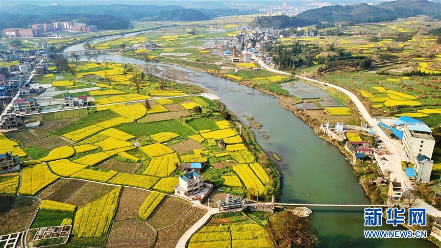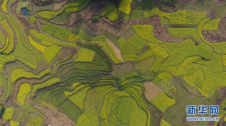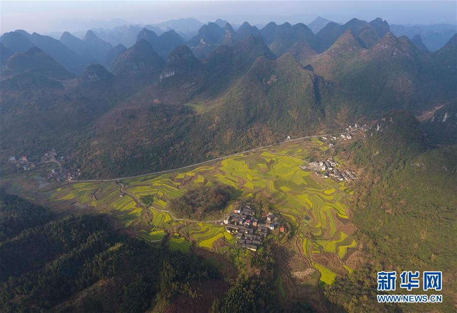 3月20日在贵州锦屏县新化乡拍摄的春景(无人机拍摄)。春分将至,贵州各地成片的油菜花渐次绽放,如同金色的地毯铺上云贵高原。 新华社记者 欧东衢 摄