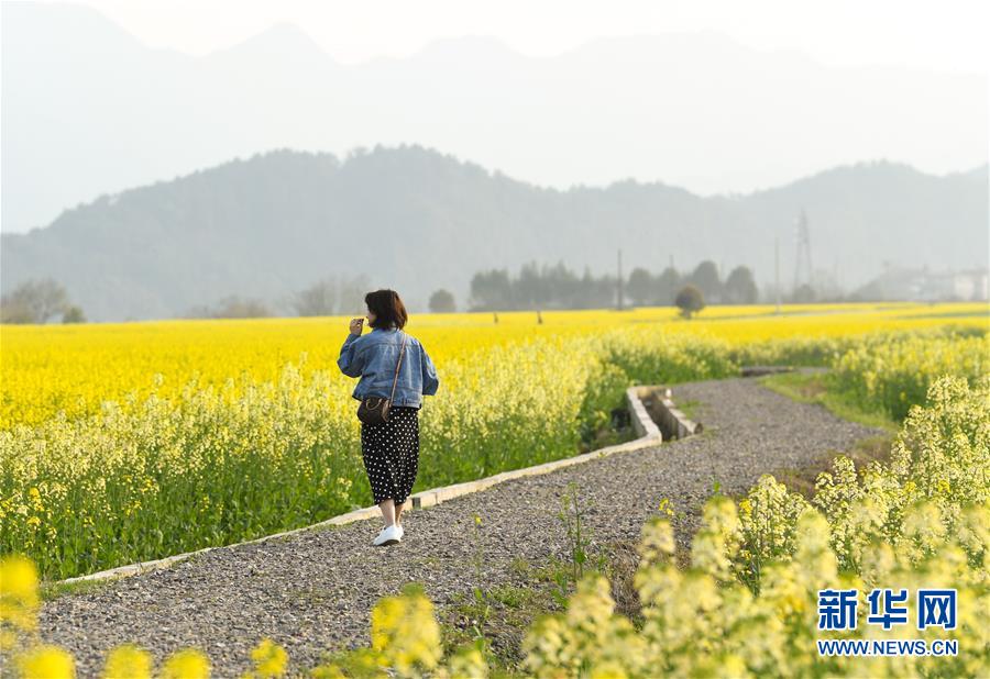 3月19日,游人在下涯镇油菜花海中游玩。近日,浙江省建德市下涯镇油菜花盛开,吸引不少游客前来踏春。 新华社记者翁忻旸摄