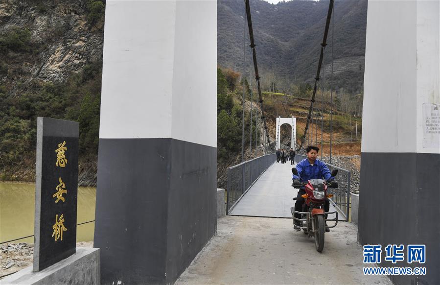 3月25日,略阳县徐家坪镇药木院村村民骑着摩托车行驶在新修的钢结构吊桥上。 新华社记者陶明摄