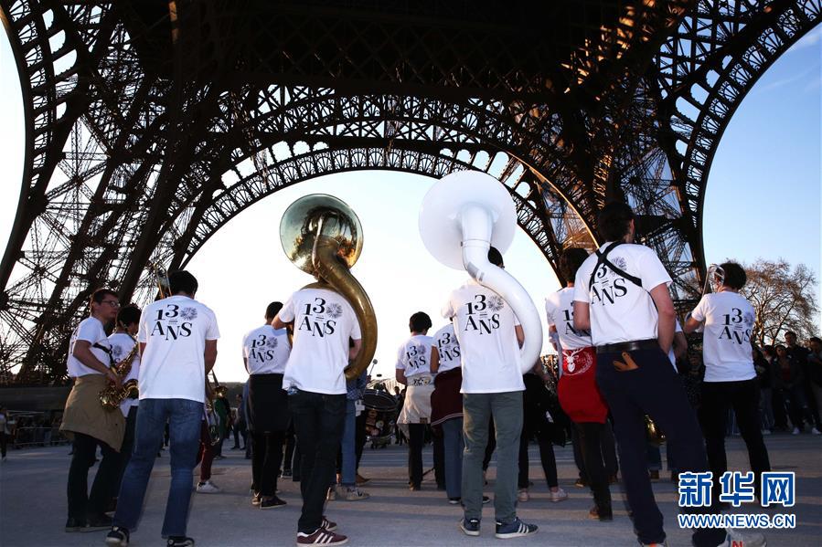 3月30日,在法国巴黎,乐队在埃菲尔铁塔下表演。于1889年3月31日正式落成的法国巴黎埃菲尔铁塔迎来130岁生日。从30日起,包括演出、冒险游戏、图片展在内的多项活动在埃菲尔铁塔举行,为这座宏伟建筑庆生。新华社记者 高静 摄