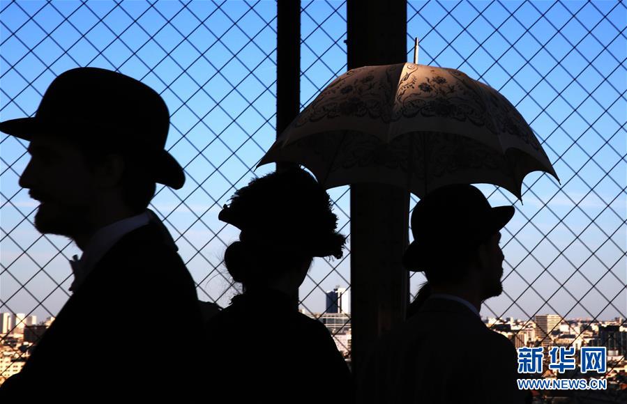 3月30日,在法国巴黎,音乐剧《300米高塔》的演员身着19世纪服装站在埃菲尔铁塔一层平台上。于1889年3月31日正式落成的法国巴黎埃菲尔铁塔迎来130岁生日。从30日起,包括演出、冒险游戏、图片展在内的多项活动在埃菲尔铁塔举行,为这座宏伟建筑庆生。新华社记者 高静 摄