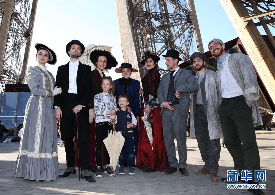3月30日,在法国巴黎,音乐剧《300米高塔》的演员身着19世纪服装在埃菲尔铁塔一层平台合影。于1889年3月31日正式落成的法国巴黎埃菲尔铁塔迎来130岁生日。从30日起,包括演出、冒险游戏、图片展在内的多项活动在埃菲尔铁塔举行,为这座宏伟建筑庆生。新华社记者 高静 摄