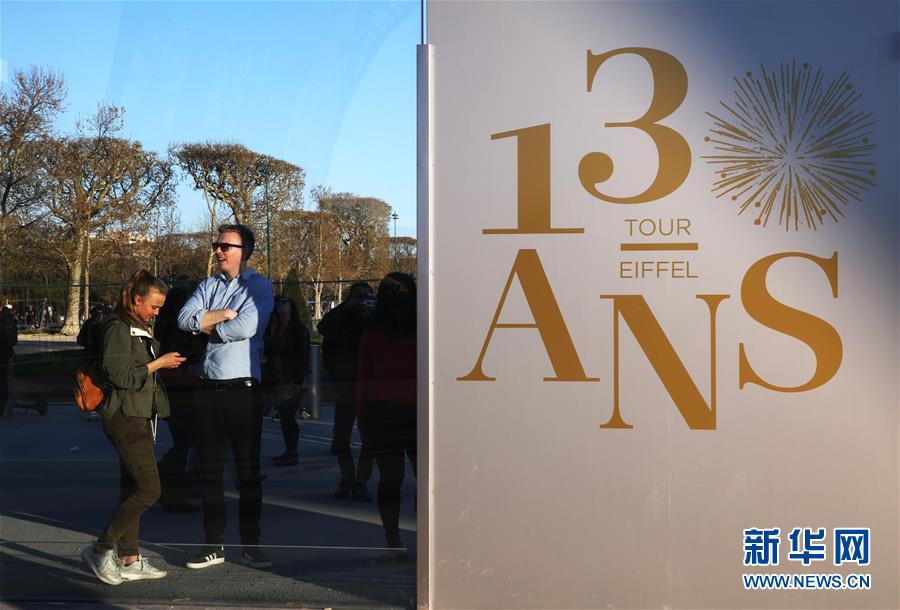 3月30日,在法国巴黎,人们走过庆祝埃菲尔铁塔落成130周年的宣传牌。于1889年3月31日正式落成的法国巴黎埃菲尔铁塔迎来130岁生日。从30日起,包括演出、冒险游戏、图片展在内的多项活动在埃菲尔铁塔举行,为这座宏伟建筑庆生。新华社记者 高静 摄
