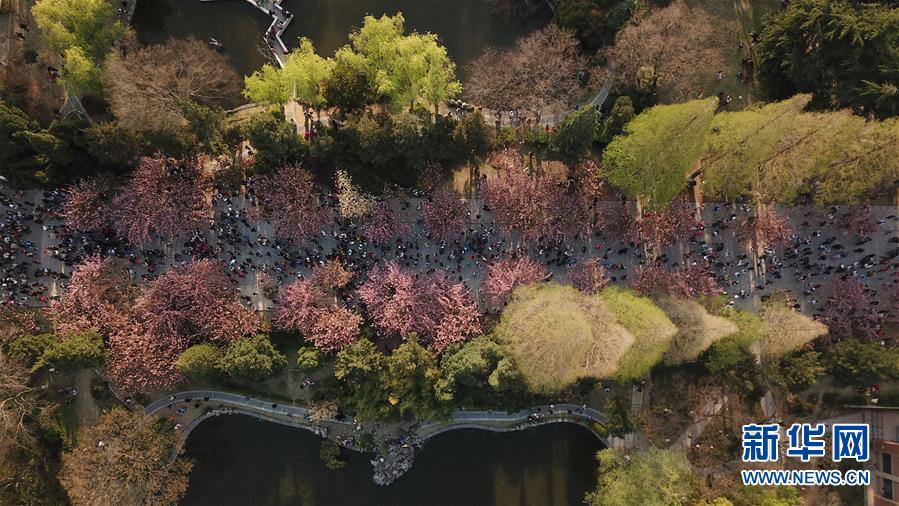 3月31日,游客在中国科学技术大学东区观赏樱花(无人机拍摄)。