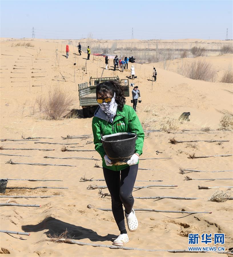 3月31日,一名青年志愿者正在取水浇灌。 当日,200余名中韩两国青年志愿者来到内蒙古自治区达拉特旗库布其沙漠种树。2006年起,中国国际青年交流中心与韩国韩中文化青少年协会组织两国青年志愿者在库布其沙漠植树,参与防沙固沙项目。截至目前已植树850多万株,造林3万多亩。 新华社记者 刘磊 摄