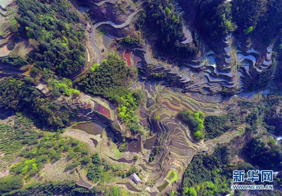 这是3月29日无人机拍摄的广西融水苗族自治县杆洞乡党鸠村的田园春色。