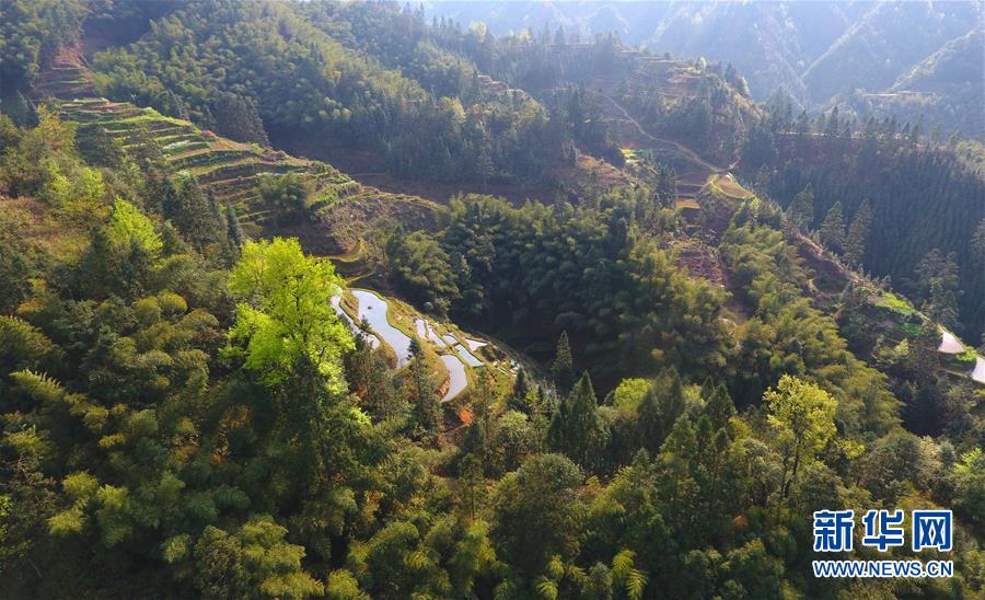 这是广西融水苗族自治县杆洞乡党鸠村的田园春色(3月29日无人机拍摄)。