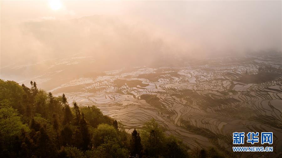 这是在云南省元阳县拍摄的晨曦中的哈尼梯田美景(4月4日无人机拍摄)。哈尼梯田位于云南省哀牢山南部,以哈尼族为主的当地群众千百年来生生不息在大地上“雕刻”出这一农耕文明奇观。春日里,漫山的水稻梯田与云海、森林、村庄形成一幅美丽的画卷,吸引众多海内外游客前来观赏。新华社记者 胡超 摄