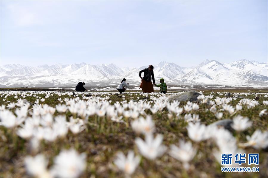 4月4日,游客在新疆那拉提景区雪山脚下拍摄盛开的野百合。