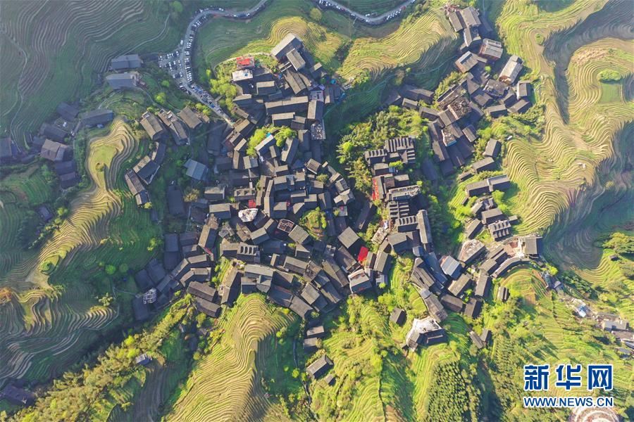 龙胜各族自治县和平乡平安村一景(4月7日无人机拍摄)。连日降雨过后,广西龙胜各族自治县和平乡平安村的壮族村寨迎来久违的朝阳。 新华社记者 曹祎铭 摄