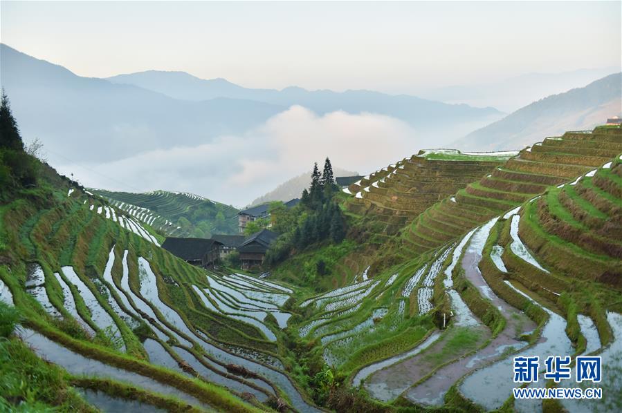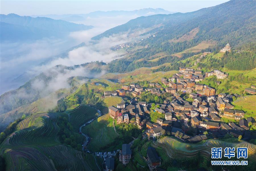 龙胜各族自治县和平乡平安村一景(4月7日摄)。连日降雨过后,广西龙胜各族自治县和平乡平安村的壮族村寨迎来久违的朝阳。 新华社记者 曹祎铭 摄