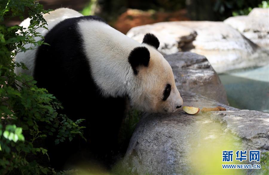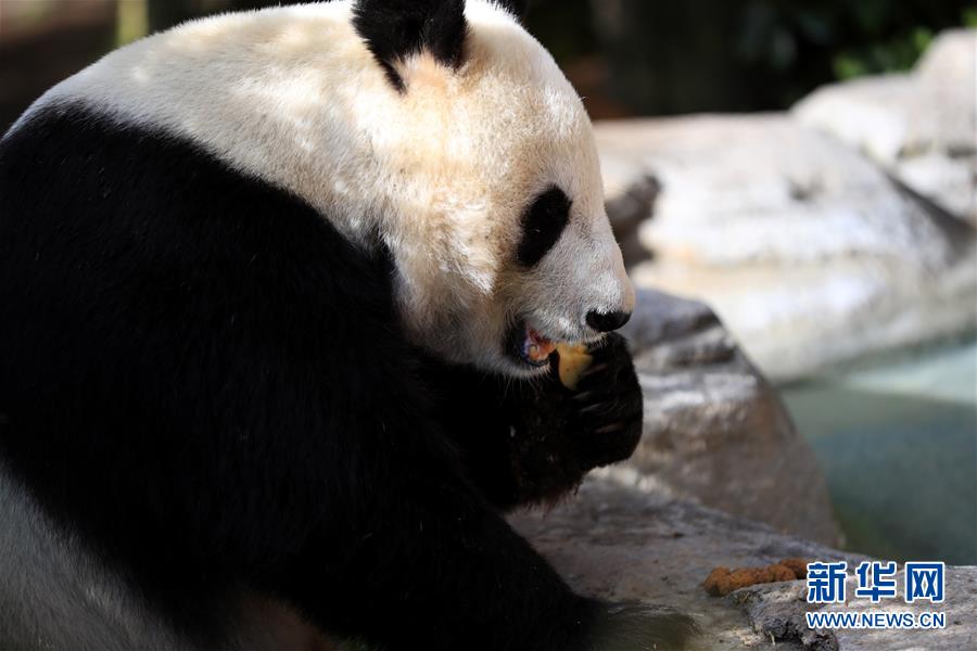 4月6日,在美国圣迭戈动物园熊猫馆,大熊猫“白云”在吃水果。新华社记者李颖摄