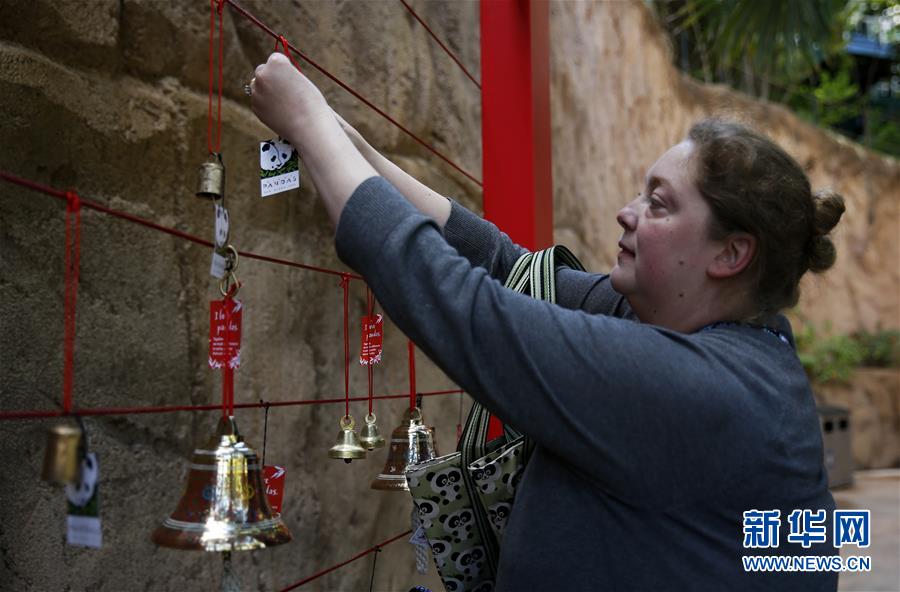 4月6日,在美国圣迭戈动物园,一名游客在“大熊猫友谊墙”上挂上祝福签。新华社记者李颖摄