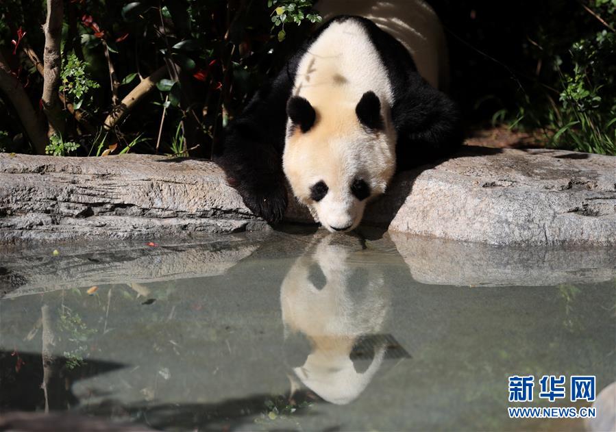 4月6日,在美国圣迭戈动物园熊猫馆,大熊猫“白云”在喝水。新华社记者李颖摄