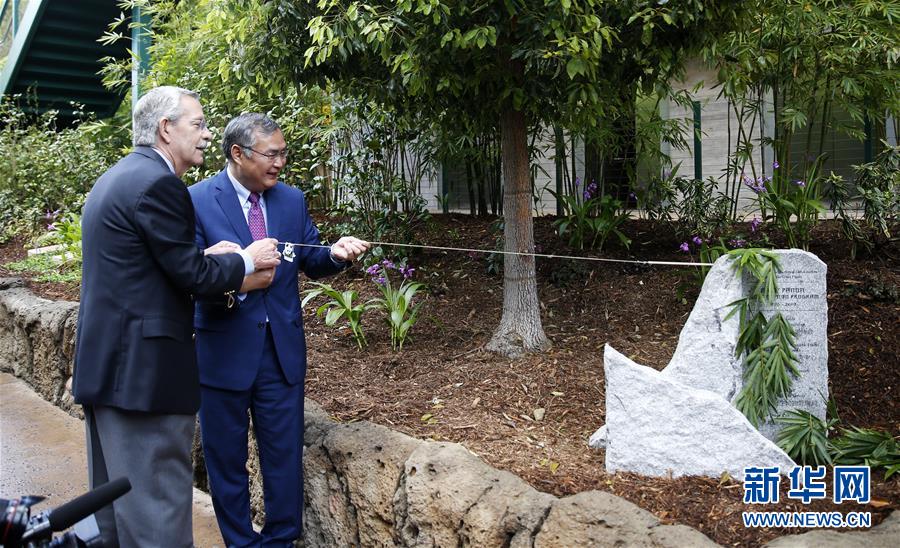 4月6日,在美国圣迭戈动物园,中国驻洛杉矶总领事张平(右)为“大熊猫保护项目”纪念碑揭幕。新华社记者李颖摄