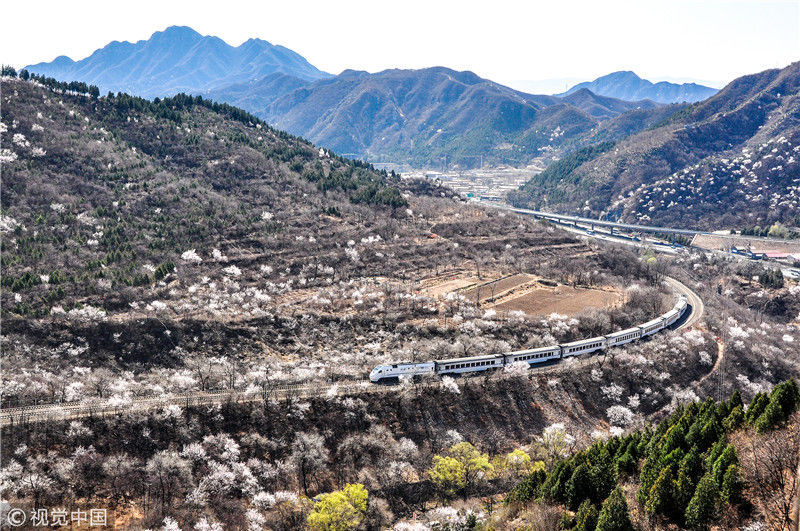 2019年3月22日,北京居庸关附近的山花盛开,S2线列车穿行在花海之中,构成一幅美丽的画面。时永平/千龙图像/视觉中国 编辑/陈进