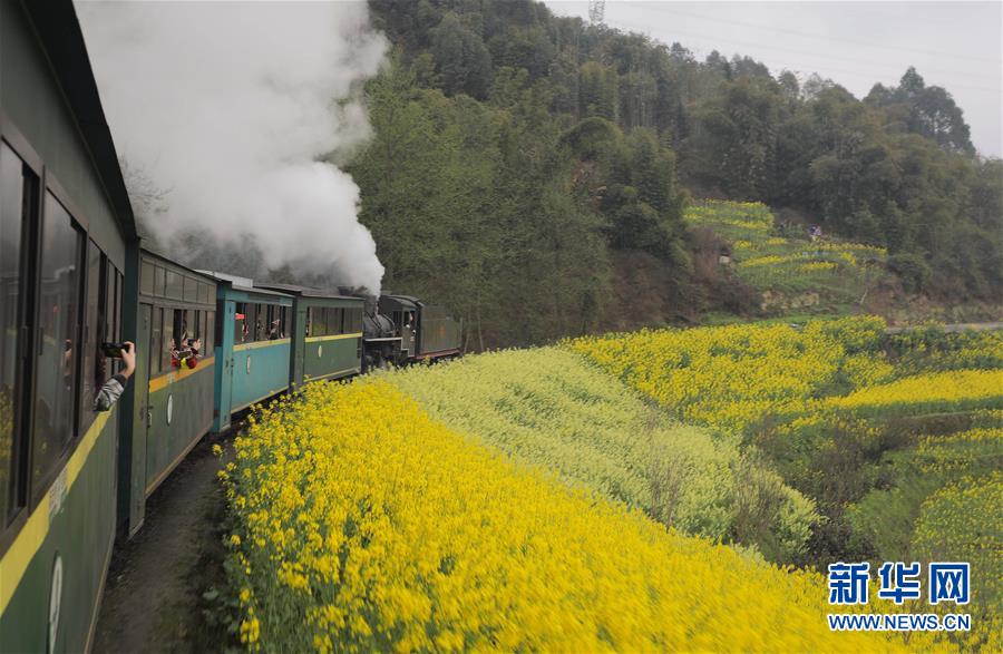 3月20日,一列嘉阳小火车在油菜花丛中穿行。