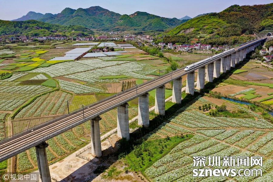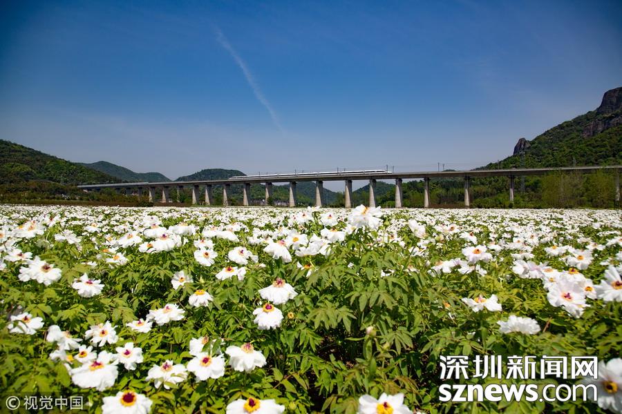 2019年4月8日,一列高铁列车从京福高铁安徽铜陵段一片盛开的凤丹花海中驶过。随着气温回升,安徽省铜陵市境内的凤丹竞相绽放,高铁列车穿行其间,成为春日里一道美丽的风景线。