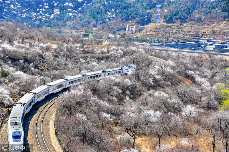 2019年3月22日,北京居庸关附近的山花盛开,S2线列车穿行在花海之中,构成一幅美丽的画面。