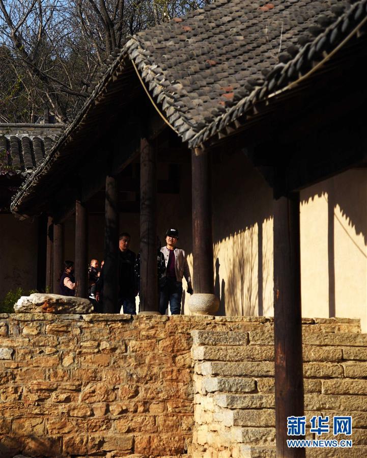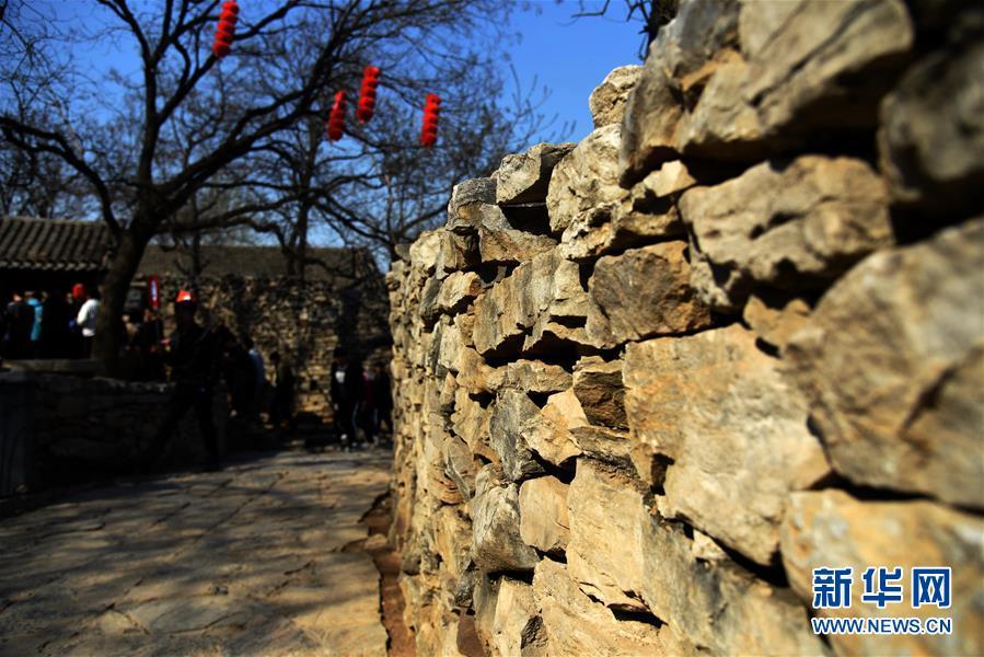 3月31日,游客在上九山村入口处游览。山东省邹城市石墙镇上九山村始建于宋代,是一座依山而建的石头村,有明清建筑风格的古民居300余套,古朴传统的村貌吸引众多游客。2019年1月,上九山村入选第七批中国历史文化名村。 新华社记者 王凯 摄