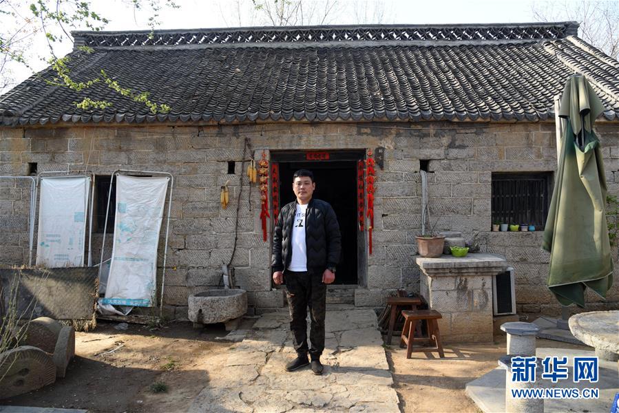 郑磊在山东省邹城市石墙镇上九山景区内第一家农家乐“上九人家”院内留影(3月31日摄)。 新华社记者王凯摄