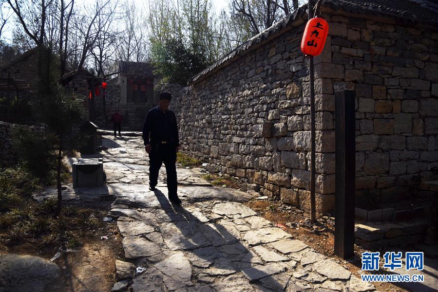 3月31日,村民挑担走在上九山村的一条小道上。山东省邹城市石墙镇上九山村始建于宋代,是一座依山而建的石头村,有明清建筑风格的古民居300余套,古朴传统的村貌吸引众多游客。2019年1月,上九山村入选第七批中国历史文化名村。 新华社记者 王凯 摄