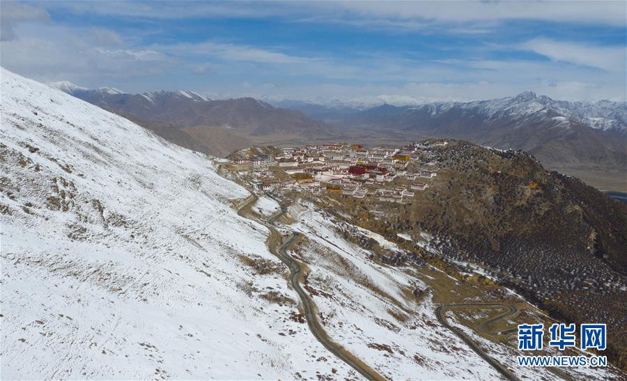 雪后的甘丹寺(4月8日无人机拍摄)。新华社记者普布扎西摄