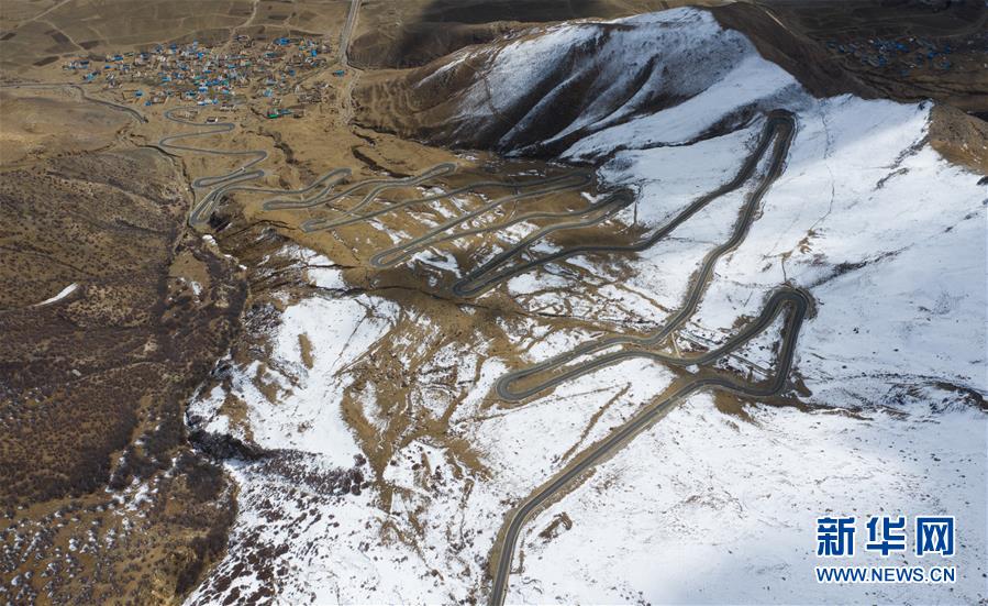 通往甘丹寺的崎岖山路(4月8日无人机拍摄)。 新华社记者普布扎西摄