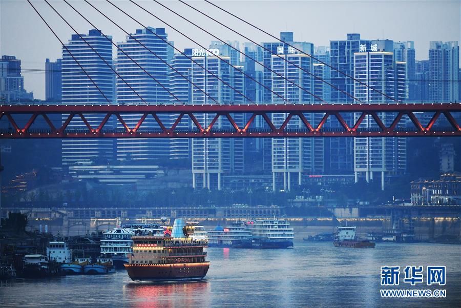 这是4月5日拍摄的夜幕下的重庆朝天门码头一带景象。 千里为重,广大为庆。城在山水间、山水在城中,重庆颇具特色的立体城市景观是城市靓丽的名片。 新华社记者 王全超 摄
