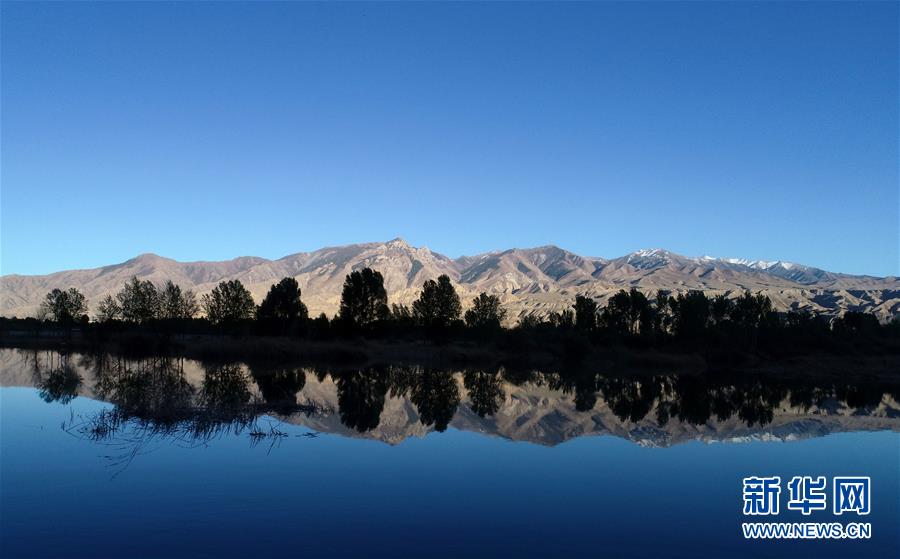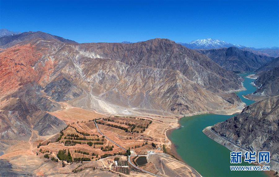 在青海贵德,千姿湖景区内群山与湖水相映成画(4月16日无人机拍摄)。地处黄河上游河段的青海省海南藏族自治州贵德县是黄土高原向青藏高原的过渡地带,黄河水流经于此,大河两岸壮美雄浑,碧水丹山相映成画,有着“天下黄河贵德清”的美誉。新华社记者 张宏祥 摄