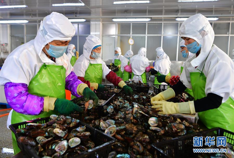 4月18日,工人在连江县筱埕镇一家鲍鱼出口加工企业加工鲍鱼。