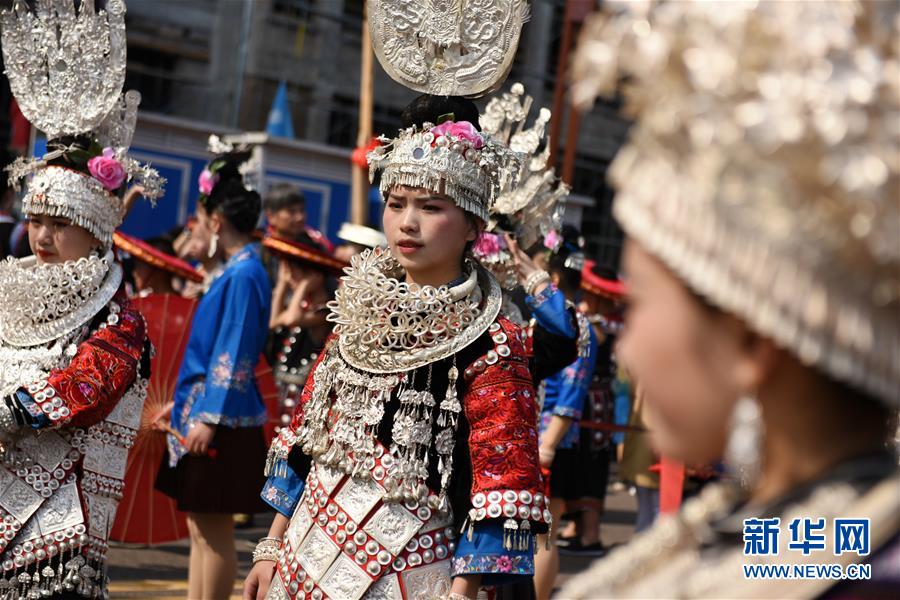 4月18日,台江县苗族群众参加盛装游演活动。 当日,贵州省黔东南苗族侗族自治州台江县迎来一年一度的苗族姊妹节。节日期间将举行苗族盛装游演、千人长桌宴、千人游方体验、苗族手工创意大赛等一系列活动。 姊妹节是台江县苗族同胞的传统节日,2006年被列入第一批国家级非物质文化遗产名录。 新华社记者 杨文斌 摄