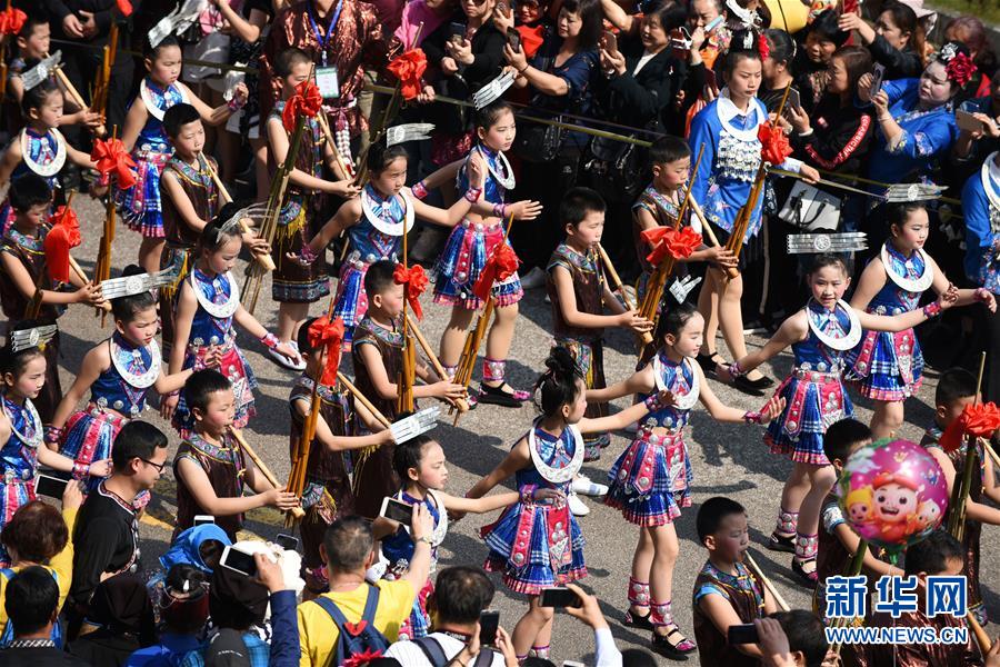 4月18日,台江县苗族群众参加盛装游演活动。 当日,贵州省黔东南苗族侗族自治州台江县迎来一年一度的苗族姊妹节。节日期间将举行苗族盛装游演、千人长桌宴、千人游方体验、苗族手工创意大赛等一系列活动。 姊妹节是台江县苗族同胞的传统节日,2006年被列入第一批国家级非物质文化遗产名录。 新华社记者 杨文斌 摄