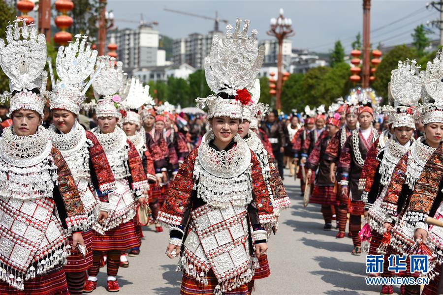 4月18日,台江县苗族群众参加盛装游演活动。 当日,贵州省黔东南苗族侗族自治州台江县迎来一年一度的苗族姊妹节。节日期间将举行苗族盛装游演、千人长桌宴、千人游方体验、苗族手工创意大赛等一系列活动。 姊妹节是台江县苗族同胞的传统节日,2006年被列入第一批国家级非物质文化遗产名录。 新华社记者 杨文斌 摄