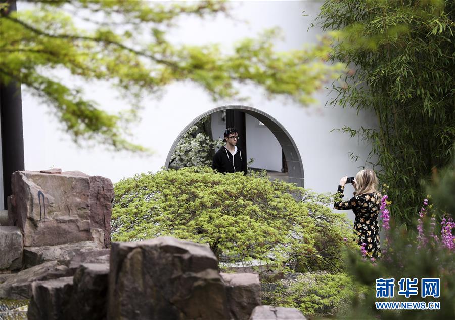2017年4月27日,游客在美国纽约寄兴园内拍照。仿照中国苏州园林设计建造的寄兴园位于纽约斯塔滕岛,占地面积约4000平方米,其所用的建筑材料大都在苏州加工制造,并由40名来自苏州的艺术家和工匠历时6个月在纽约修建而成。 新华社记者王迎摄