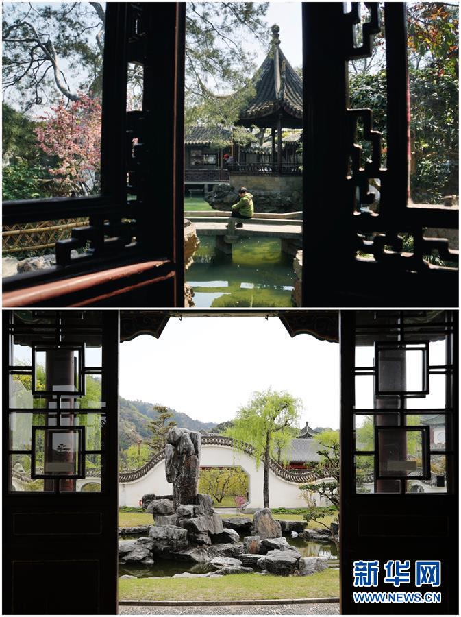这张拼版照片展示的是:上图,2019年4月1日拍摄的中国苏州网师园(新华社记者杜涓涓摄);下图,2019年4月18日拍摄的日本鸟取中式园林“燕赵园”(新华社记者杜潇逸摄)。