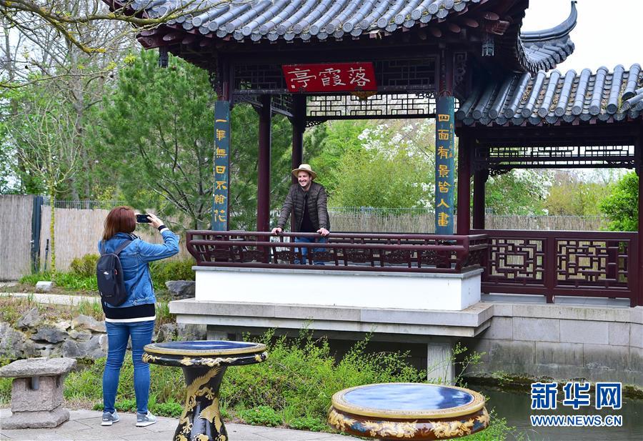 2019年4月13日,在德国曼海姆,游客在中式园林“多景园”内拍照。“多景园”位于曼海姆市路易森公园内,占地约6000平方米,建筑面积约1500平方米,是目前欧洲最为完整的中国古典园林建筑群落之一。 新华社记者逯阳摄