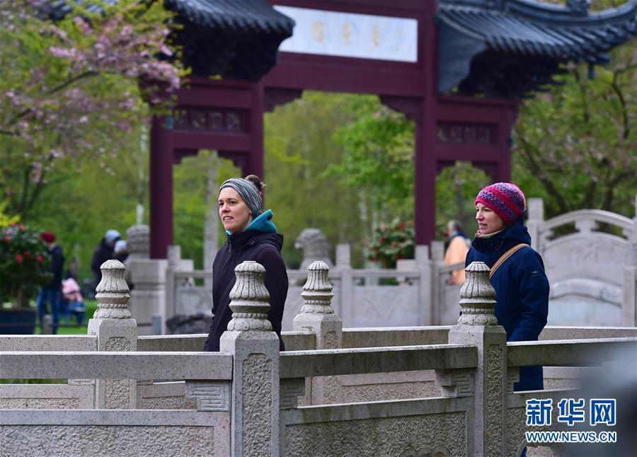 2019年4月13日,在德国曼海姆,游客在中式园林“多景园”内游玩。“多景园”位于曼海姆市路易森公园内,占地约6000平方米,建筑面积约1500平方米,是目前欧洲最为完整的中国古典园林建筑群落之一。 新华社记者逯阳摄