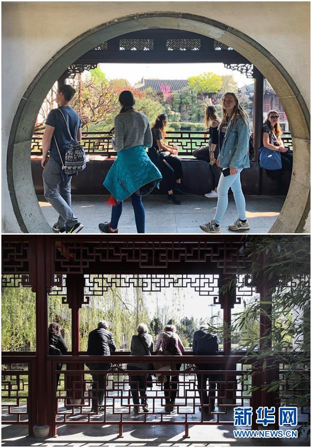 这张拼版照片展示的是:上图,2019年4月1日,外籍游客在中国苏州网师园内游览(新华社记者杜涓涓摄);下图,2019年4月17日,游客在德国柏林中式园林“得月园”内游览(新华社记者单宇琦摄)。