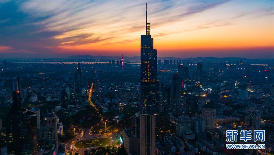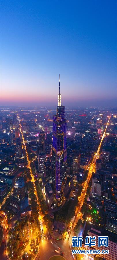 这是4月17日无人机拍摄的南京紫峰大厦和城市夜景。 新华社记者 李博 摄