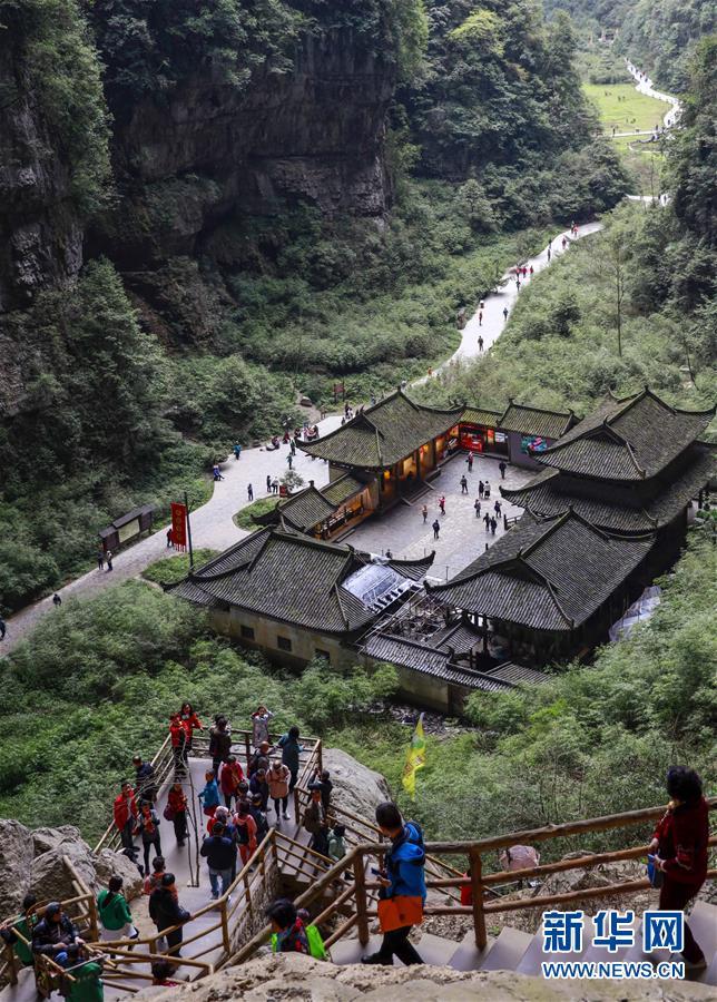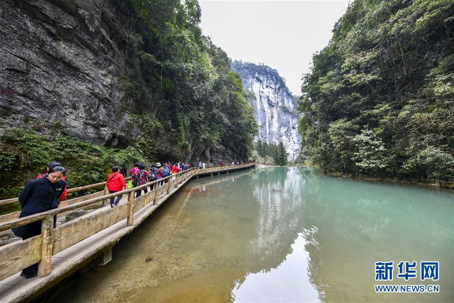 游客在天生三桥景区游览(3月27日摄)。 随着天气转暖,重庆武隆天生三桥景区风景如画,气势磅礴的天生石桥和绿意盎然的山林相映成趣,吸引众多游客前来踏春赏景。 新华社记者刘潺摄