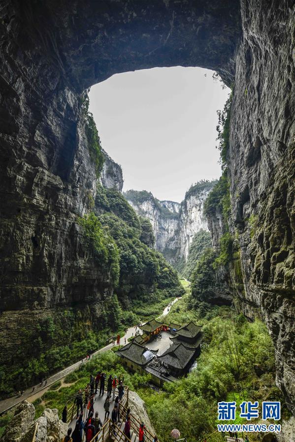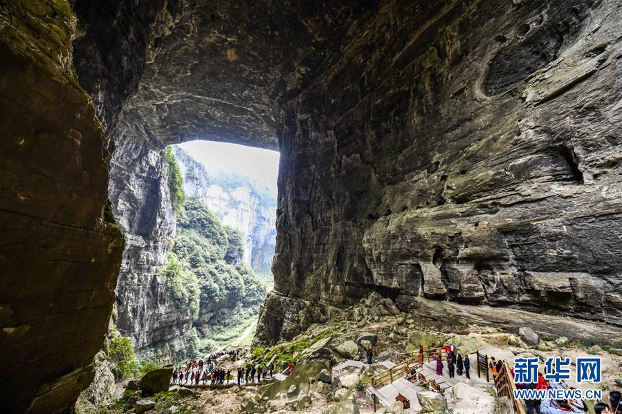 游客在天生三桥景区内的天龙桥景点游览(3月27日摄)。 随着天气转暖,重庆武隆天生三桥景区风景如画,气势磅礴的天生石桥和绿意盎然的山林相映成趣,吸引众多游客前来踏春赏景。 新华社记者刘潺摄