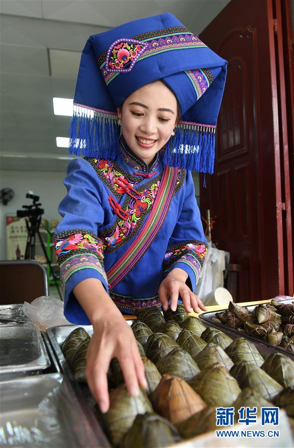 广西靖西市鹅泉景区工作人员在摆放粽子等待游客(4月16日摄)。新华社记者 陆波岸 摄