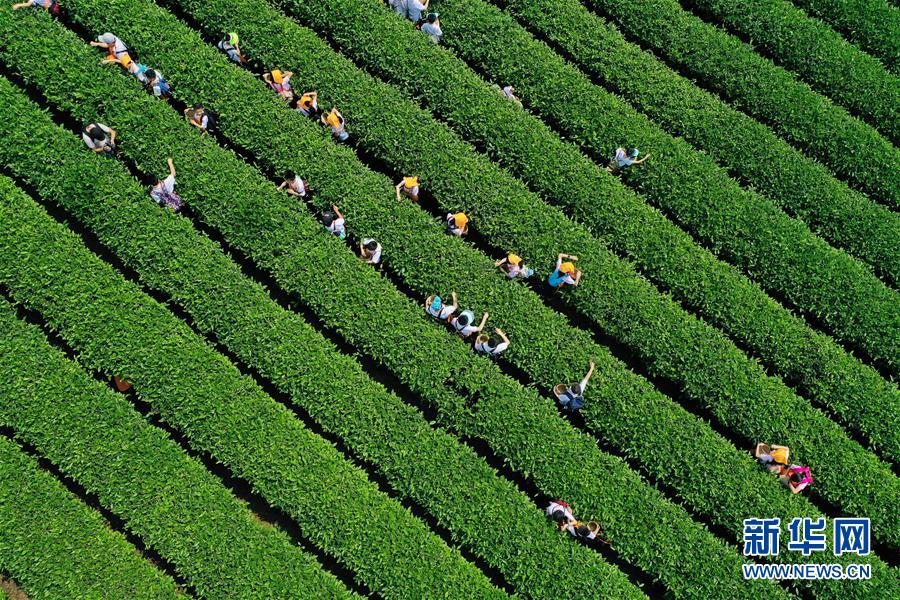 4月25日,小学生在定心茶园体验春茶采摘(无人机航拍)。当日,来自重庆市巴南区的300余名小学生来到位于巴南白象山的定心茶园,体验茶叶采摘、制作,学习茶文化礼仪。近年来,重庆市巴南区积极发展茶产业,推动“茶旅融合”“茶教融合”发展,取得了良好的经济和社会效益。 新华社记者 王全超 摄