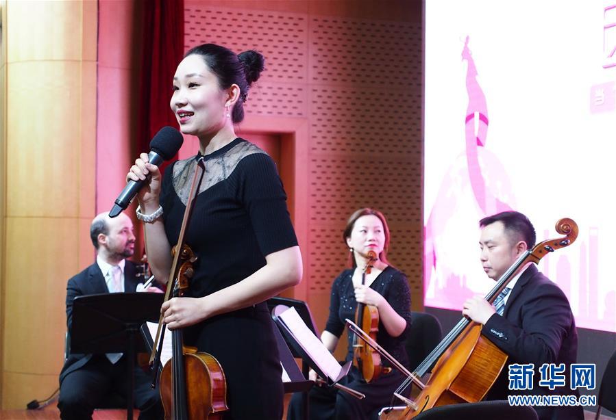 4月25日,上海交响乐团的中提琴手巴桐在演奏前介绍曲目。 当日,第一场“全城交响·上交为你而来”音乐会在复旦大学附属肿瘤医院报告厅奏响,为患者及医护人员献上一场专属音乐会。“全城交响·上交为你而来”是上海交响乐团2019年向全上海的机构及个人开放的公益演出项目。 新华社记者 任珑 摄