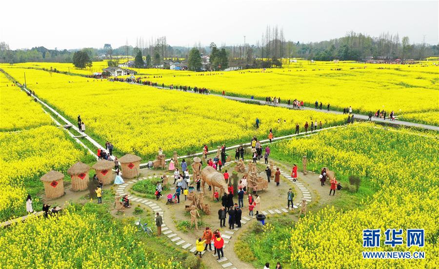 在四川都江堰市柳街镇七里诗乡,游客在油菜花地里休闲游玩(3月16日无人机拍摄)。 新华社记者 江宏景 摄